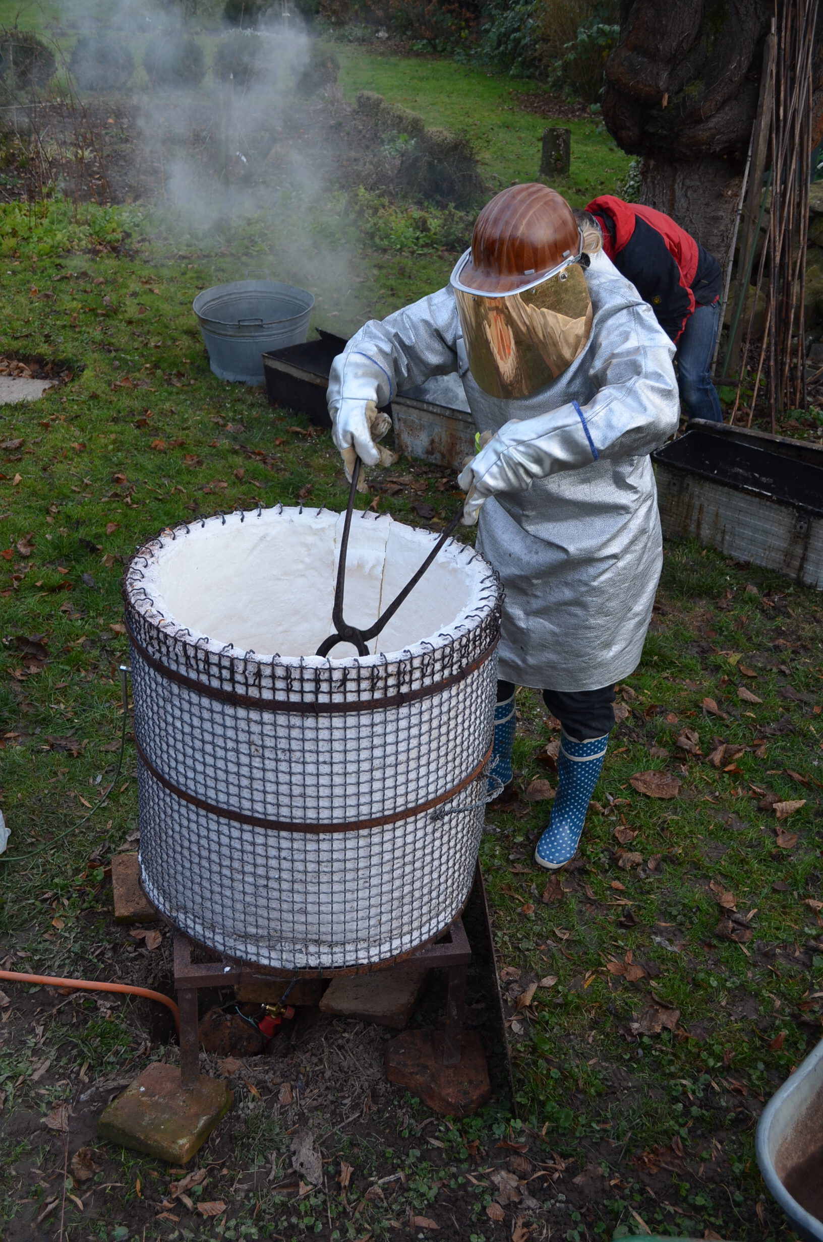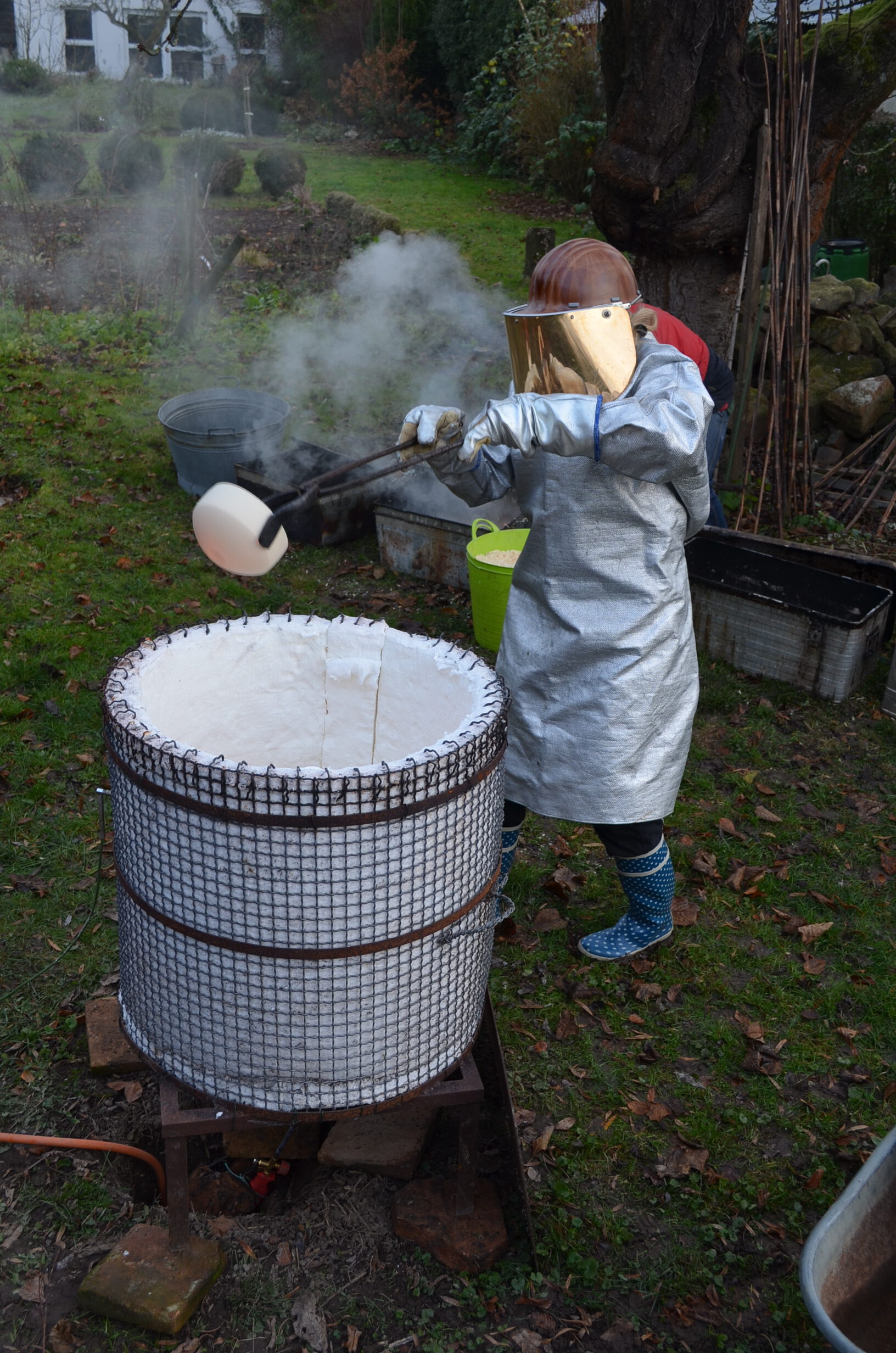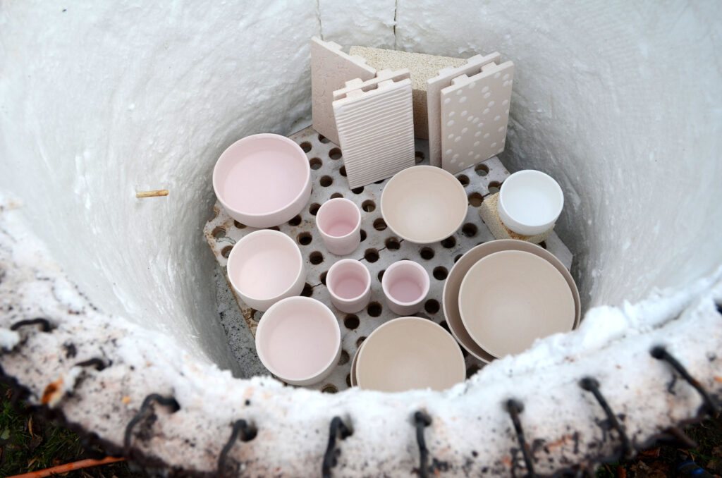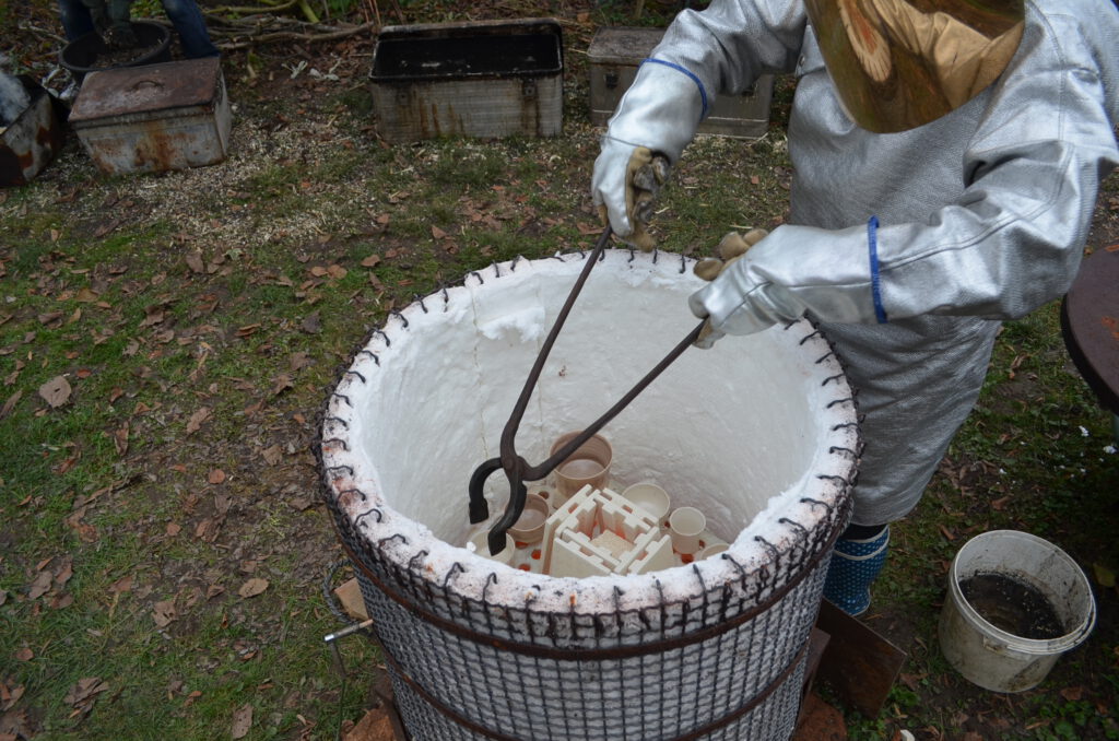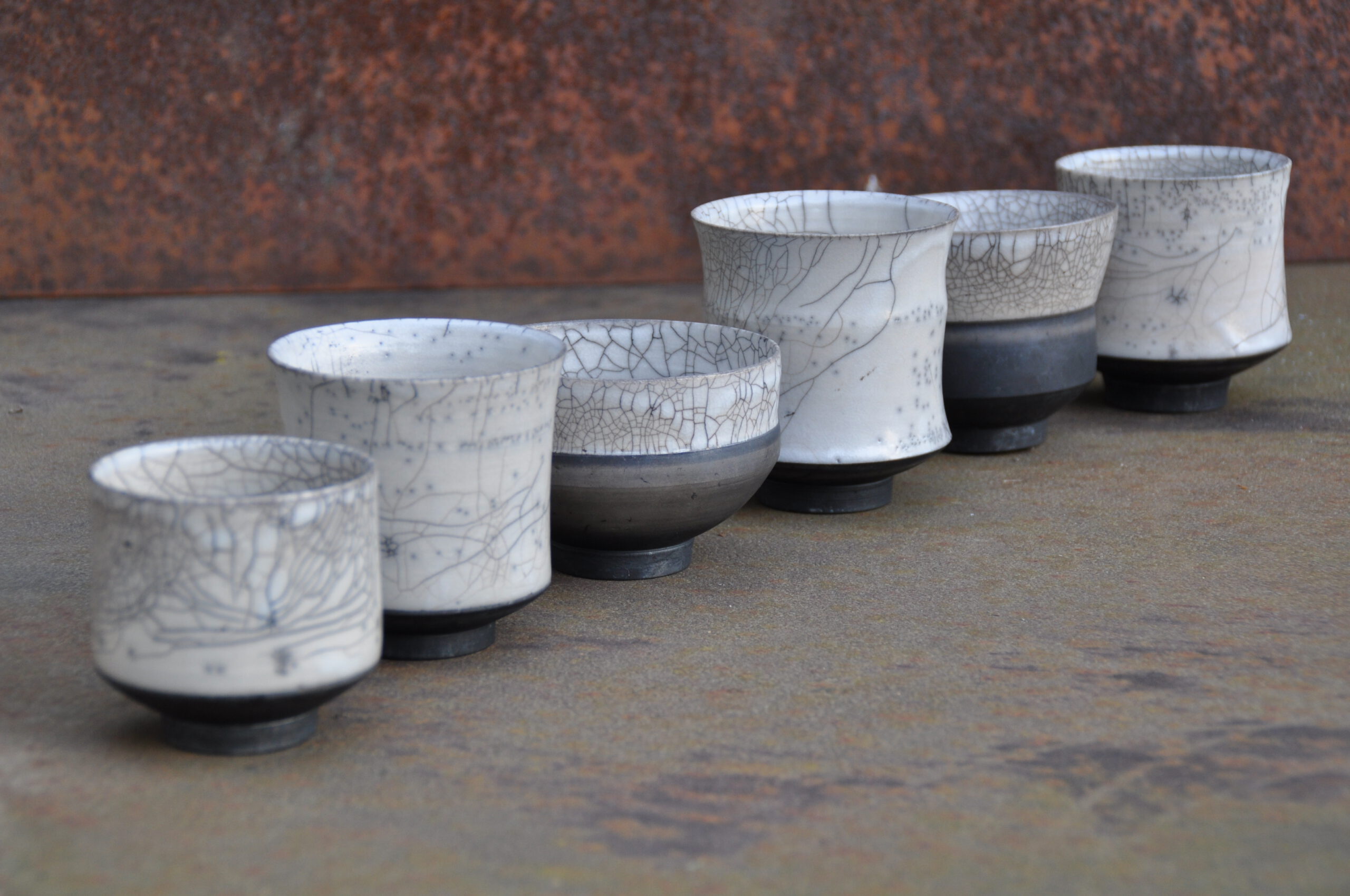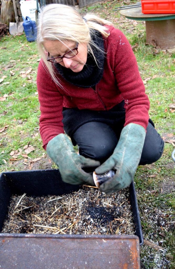 Beim Raku-Brennprozess wird das Keramikstück zunächst bei ca.1000°C gebrannt. Danach wird es aus glühend dem Ofen genommen und in einen