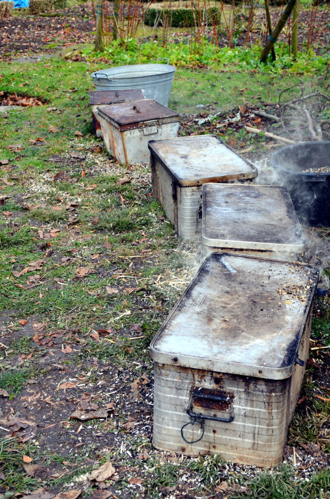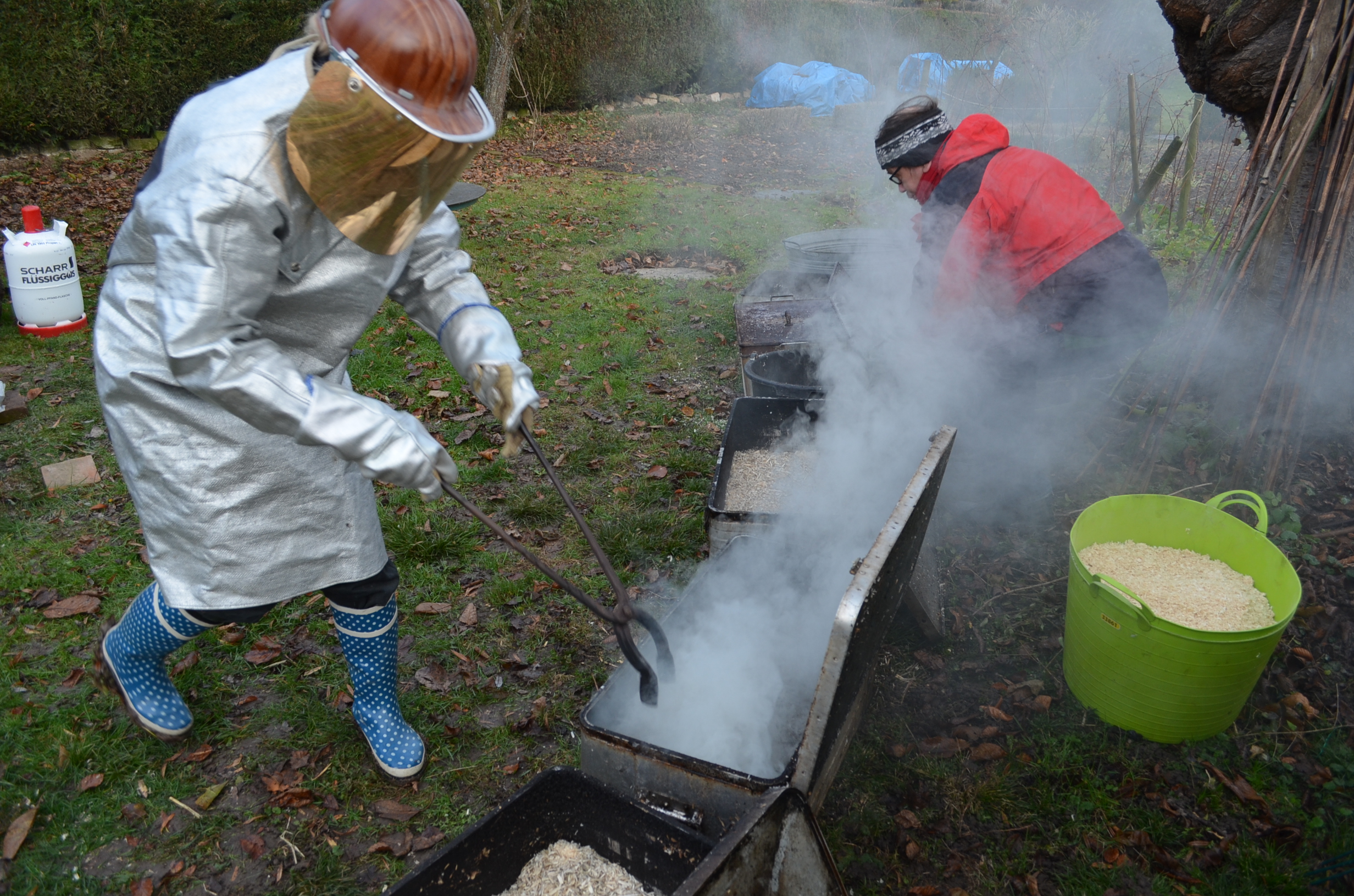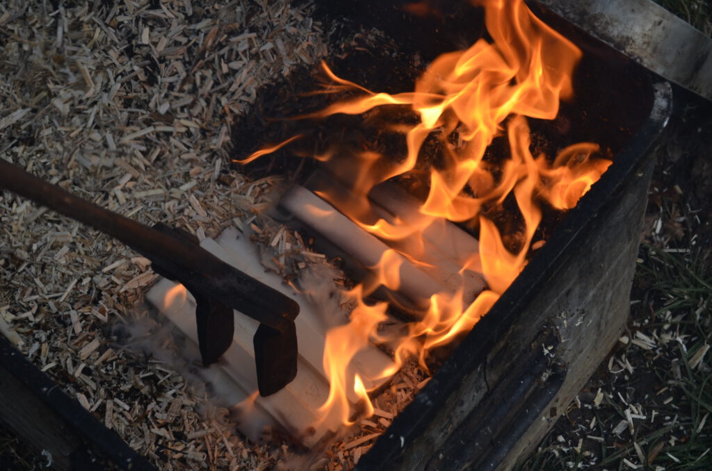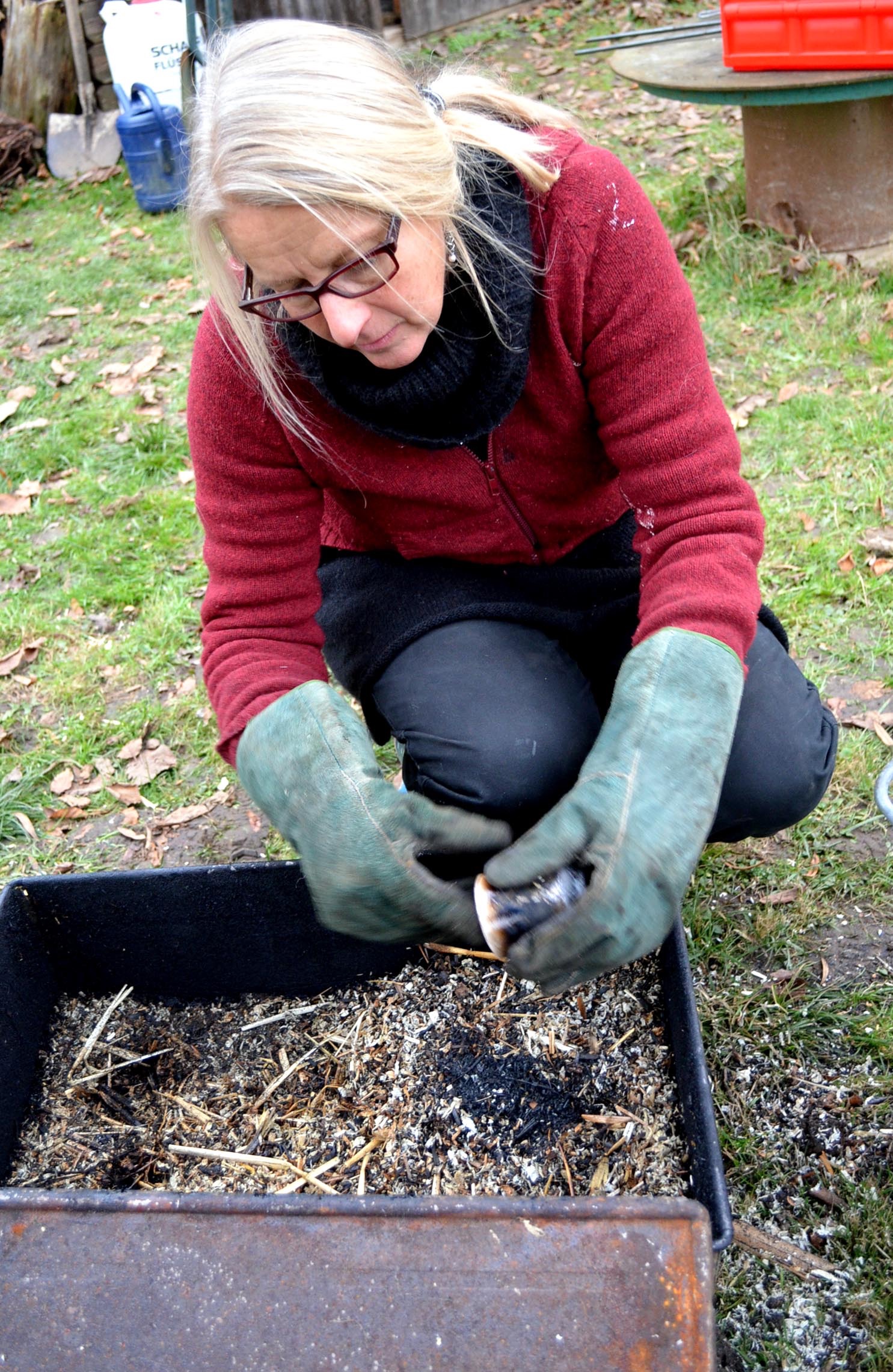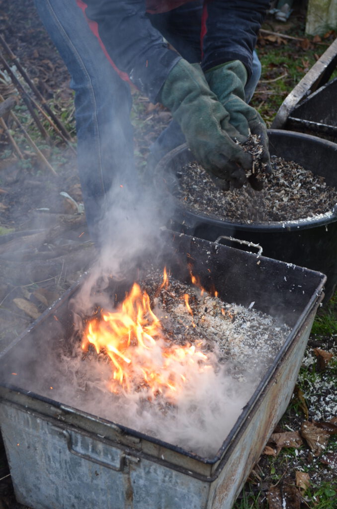 Behälter mit brennbarem Material (z. B. Sägemehl oder Blätter) gelegt, es entsteht ein Reduktionsbrand (ein Brand bei Sauerstoffmangel). Diesem Nachbrand wird das Keramikstück nach einiger Zeit entnommen und in Wasser abgekühlt.